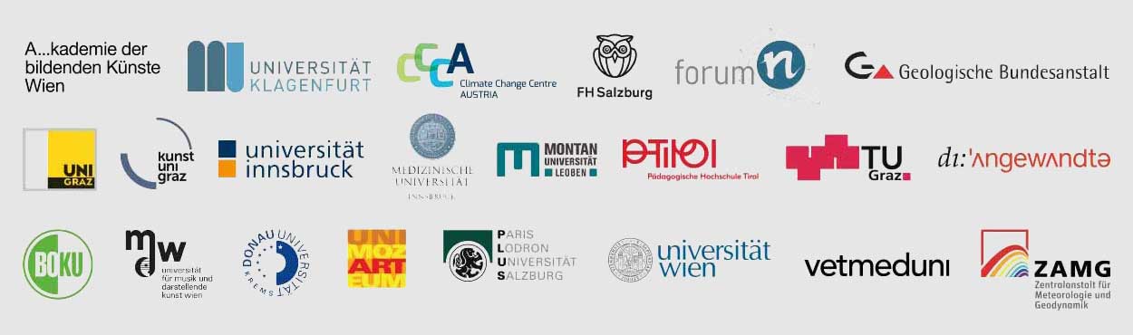 Universitäten: Akademie der bildenden Künste Wien, Alpen-Adria-Universität Klagenfurt, Fachhochschule Salzburg, Karl-Franzens-Universität Graz, Kunstuniversität Graz, Leopold-Franzens-Universität Innsbruck, Medizinische Universität Innsbruck, Montanuniversität Leoben, Technische Universität Graz, Universität für angewandte Kunst Wien, Universität für Bodenkultur Wien, Universität für Musik und darstellende Kunst, Universität für Weiterbildung Krems, Universität Mozarteum Salzburg, Universität Salzburg, Universität Wien, Pädagogische Hochschule Tirol, Veterinärmedizinische Universität Wien weitere Projektpartner_innen: Climate Change Centre Austria, forum n, Geologische Bundesanstalt, Zentralanstalt für Meteorologie und Geodynamik