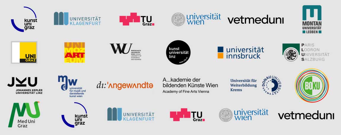 Wien: Universität für Bodenkultur Wien, Wirtschaftsuniversität Wien, Universität für Musik und darstellende Kunst Wien, Veterinärmedizinische Universität Wien, Universität für angewandte Kunst, Akademie der bildenden Künste Wien, Universität Wien Salzburg: Universität Salzburg, Universität Mozarteum Salzburg Kärnten: Universität Klagenfurt Steiermark: Universität Graz, Technische Universität Graz, Kunstuniversität Graz, Medizinische Universität Graz, Montanuniversität Leoben Tirol: Universität Innsbruck Niederösterreich: Universität für Weiterbildung Krems Oberösterreich: Johannes Kepler Universität Linz, Universität für künstlerische und industrielle Gestaltung Linz